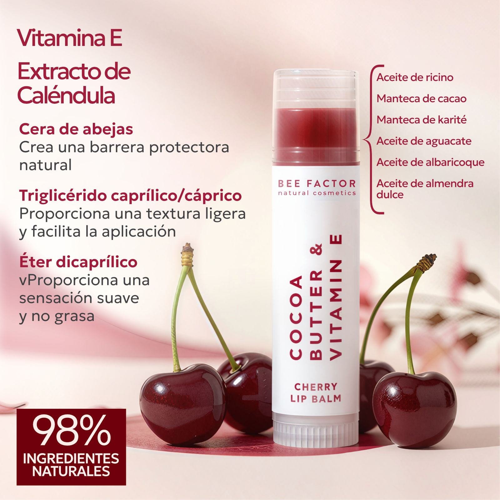 - Vitamina E (Tocoferol): Proporciona protección antioxidante y apoya la salud de los labios