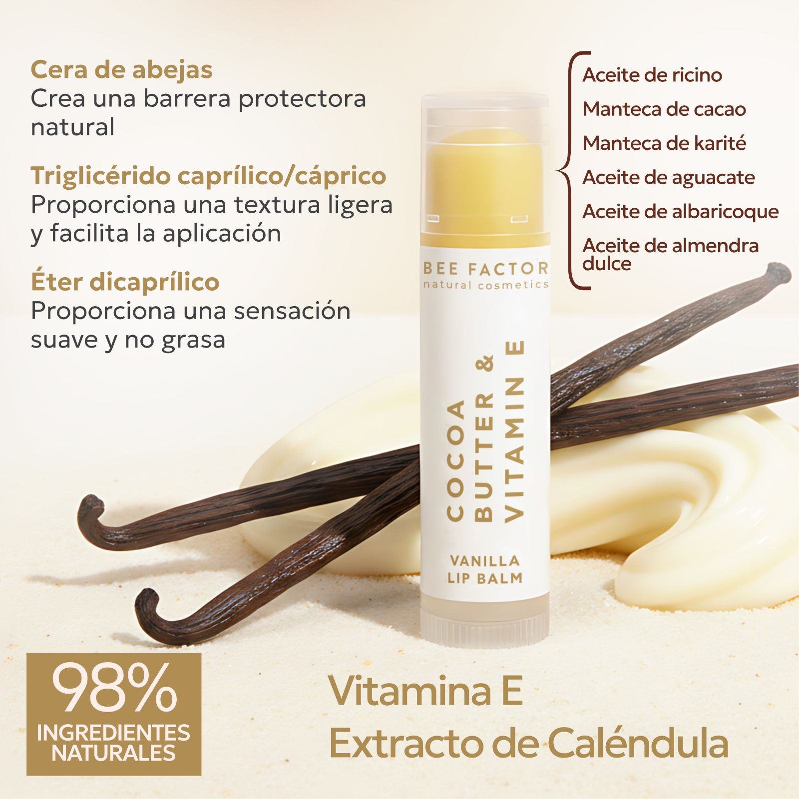 - Vitamina E (Tocoferol): Proporciona protección antioxidante y apoya la salud de los labios