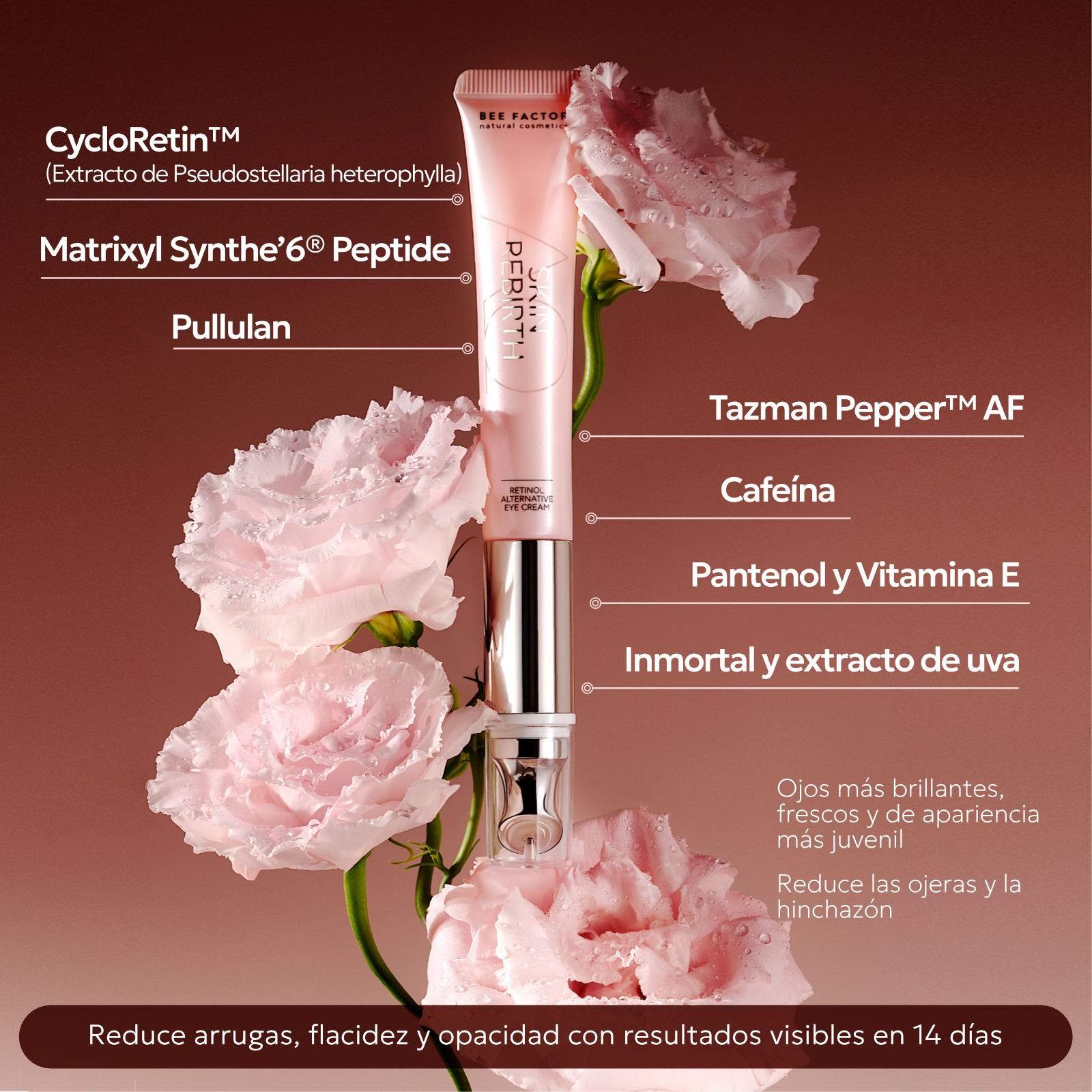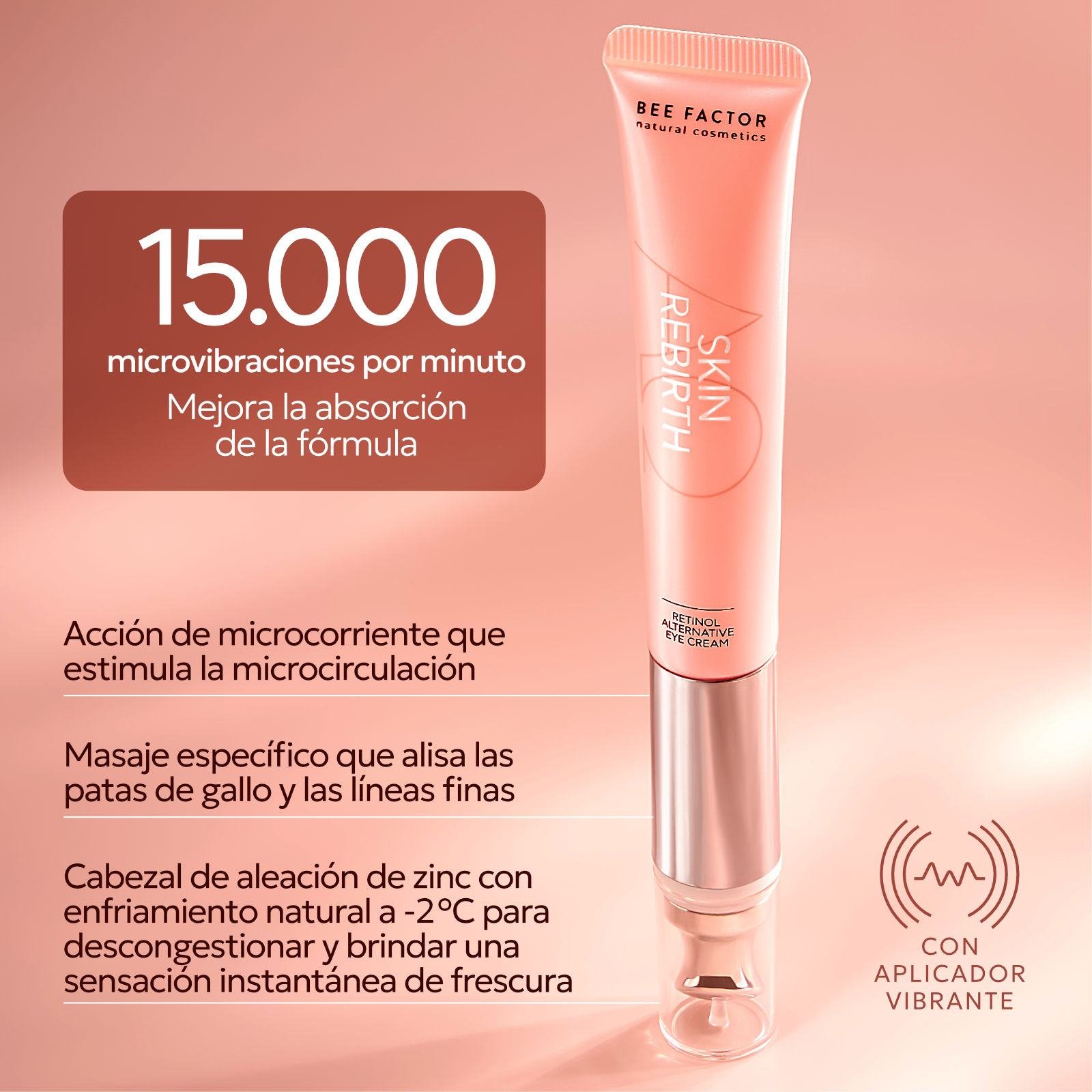 Skin Rebirth es un tratamiento específico para el contorno de ojos que combina tecnología cosmética avanzada con una experiencia profesional tipo spa. Su fórmula ofrece beneficios similares al retinol sin la irritación habitual, lo que la hace apta incluso para la delicada zona del contorno de ojos.